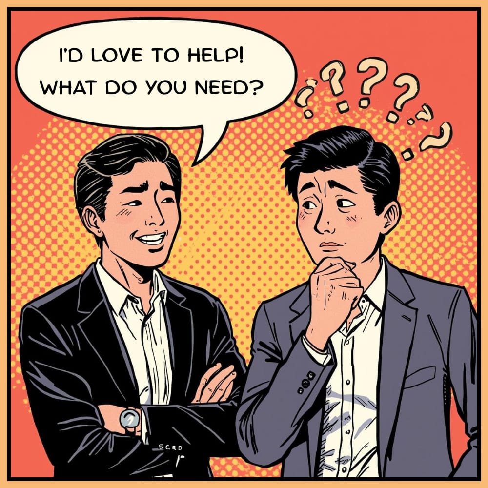 "How can I help you?" should be the best thing anyone could ask. Instead, it often triggers panic. We freeze. We downplay. We say "oh, nothing right now, but thanks!" I normally counsel people against asking it, because we’re so bad at responding to it.